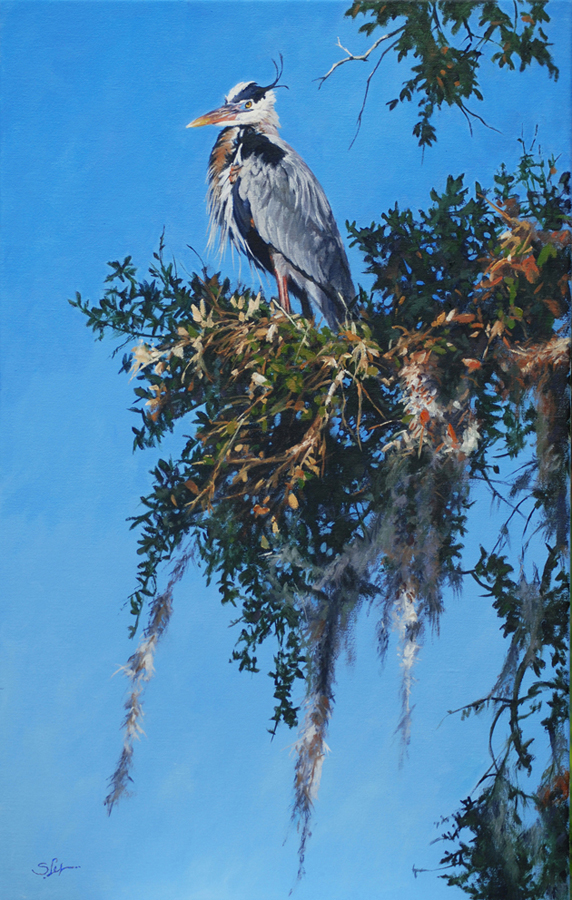 A majestic Great Blue Heron is perched high up on the branches of a live oak tree while spanish moss dance in a southern breeze.
